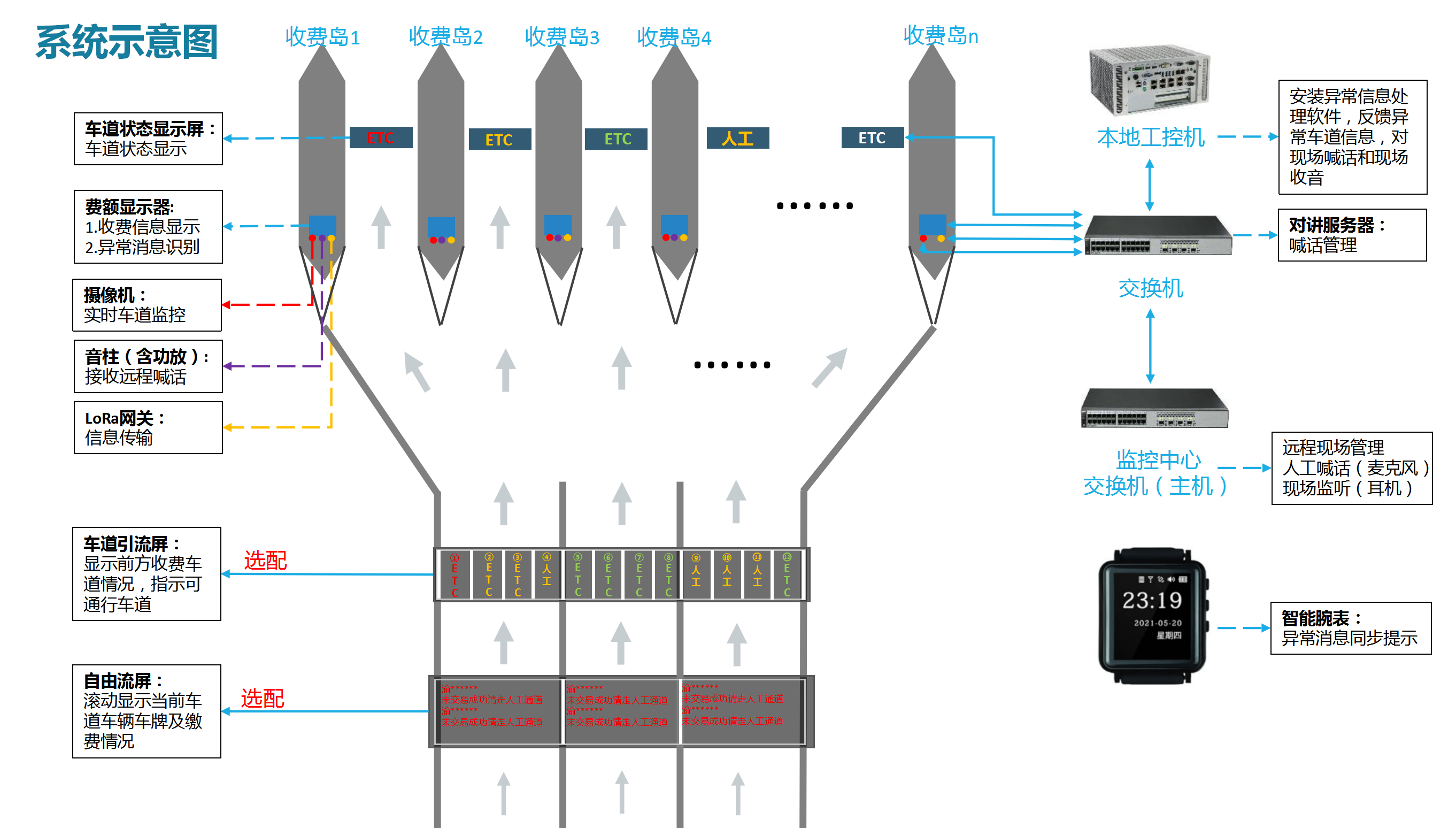 該系統(tǒng)由費(fèi)額顯示系統(tǒng)、語(yǔ)音提示系統(tǒng)、無(wú)線通信系統(tǒng)、車道狀態(tài)屏、車道引流屏共同組成。系統(tǒng)還配置了專門(mén)的軟件管理平臺(tái),可對(duì)每一條收費(fèi)車道進(jìn)行實(shí)時(shí)監(jiān)控,管理人員無(wú)需到場(chǎng)即可通過(guò)“遠(yuǎn)程喊話”的形式處理特情。系統(tǒng)還可集成自由流屏和車道引流屏,一同助力打造暢行的高速公路收費(fèi)站。